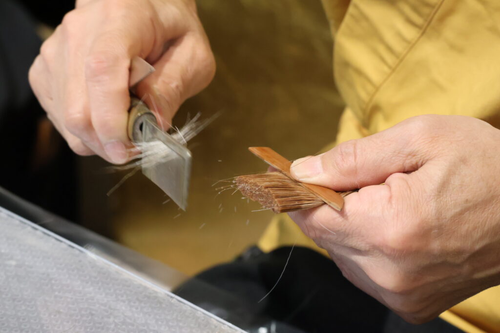 筆づくり体験(筆の仕上げ) 捌けた穂先に糊づけしたのち、先を整える |