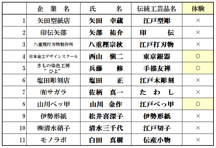 東京銀器、江戸切子、江戸型彫、印伝、江戸打刃物、手描友禅、江戸木彫刻、伊勢型紙、棕櫚たわし、江戸べっ甲