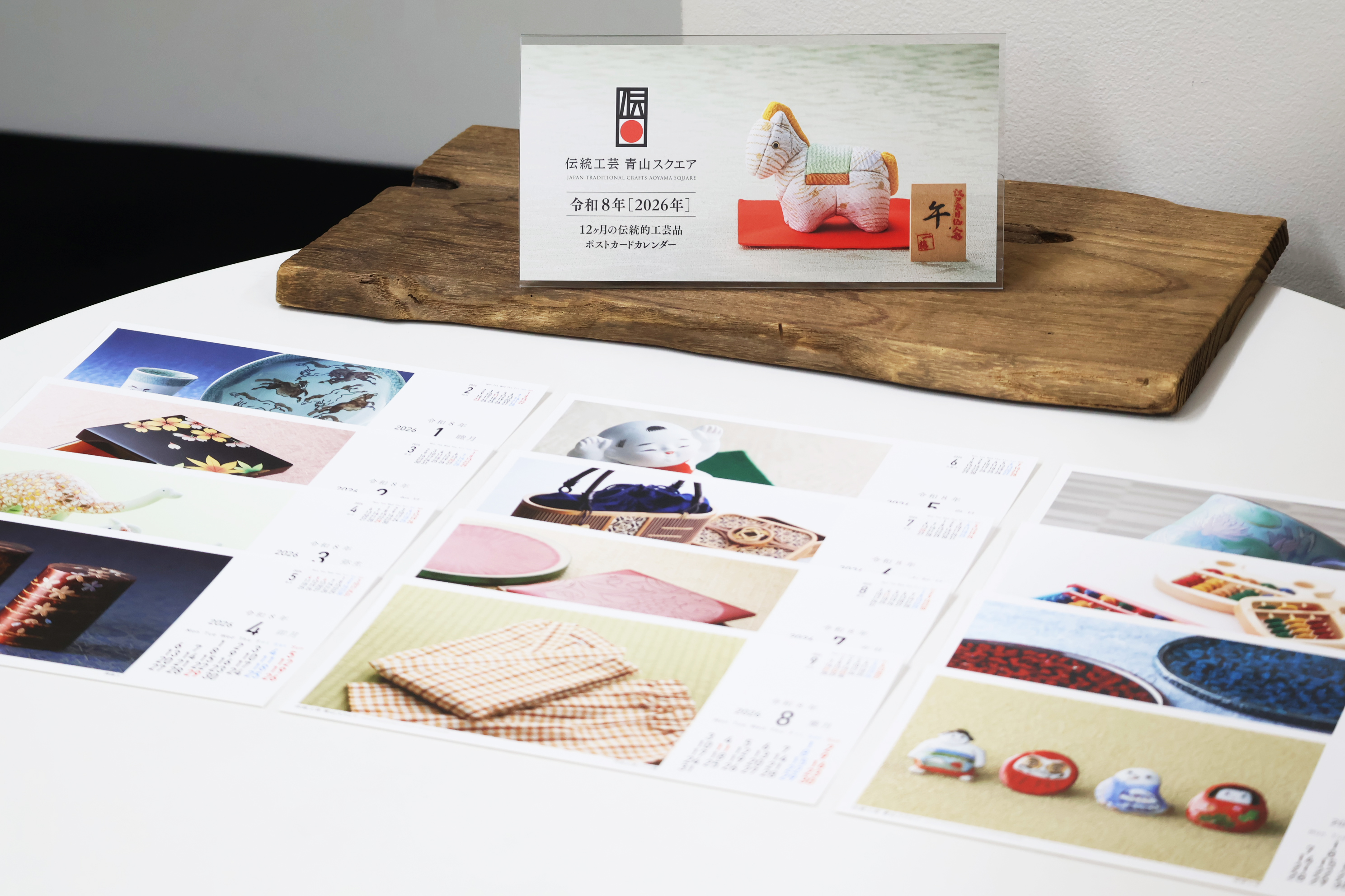 お待たせいたしました。昨年ご愛顧いただいた友の会会員のみなさまへ、令和8年(2026年)青山スクエアオリジナルカレンダーの配布を開始いたしました。12か月を彩る伝統的工芸品のポストカードカレンダーです。ぜひご活用ください。